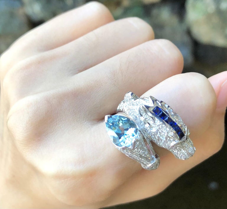 Aquamarine 1.94 carats with Blue Sapphire 0.43 carat and Diamond 0.55 carat Ring set in 18 Karat White Gold Settings